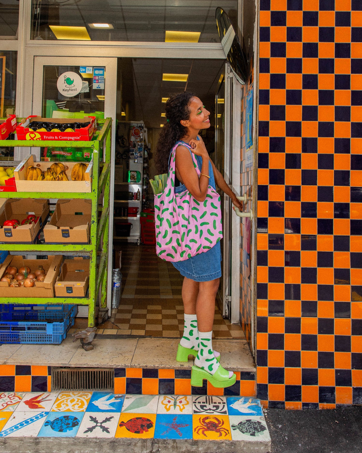 Here's a capsule collection in homage to the pickle! That delightfully tangy condiment that adds a crunch to our lives. It comes in the form of a mini hair claw, socks, pin, and keychain—not to mention the big new arrival: the shopping tote!