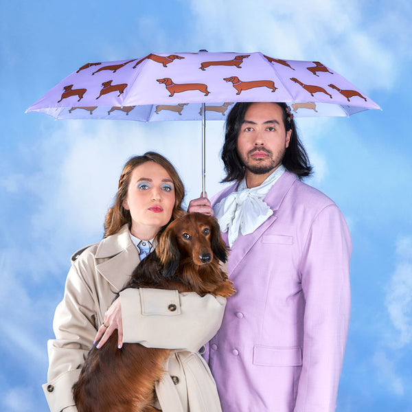 To add our touch and give company to the duck head, we decorated these umbrellas with three of our iconic doggies: the superstar Dachshund, the beloved Corgi and the timeless French Bulldog. Each posing proudly on beautiful bright colors - purple, light blue & lemon yellow - to highlight even more their adorable faces.
