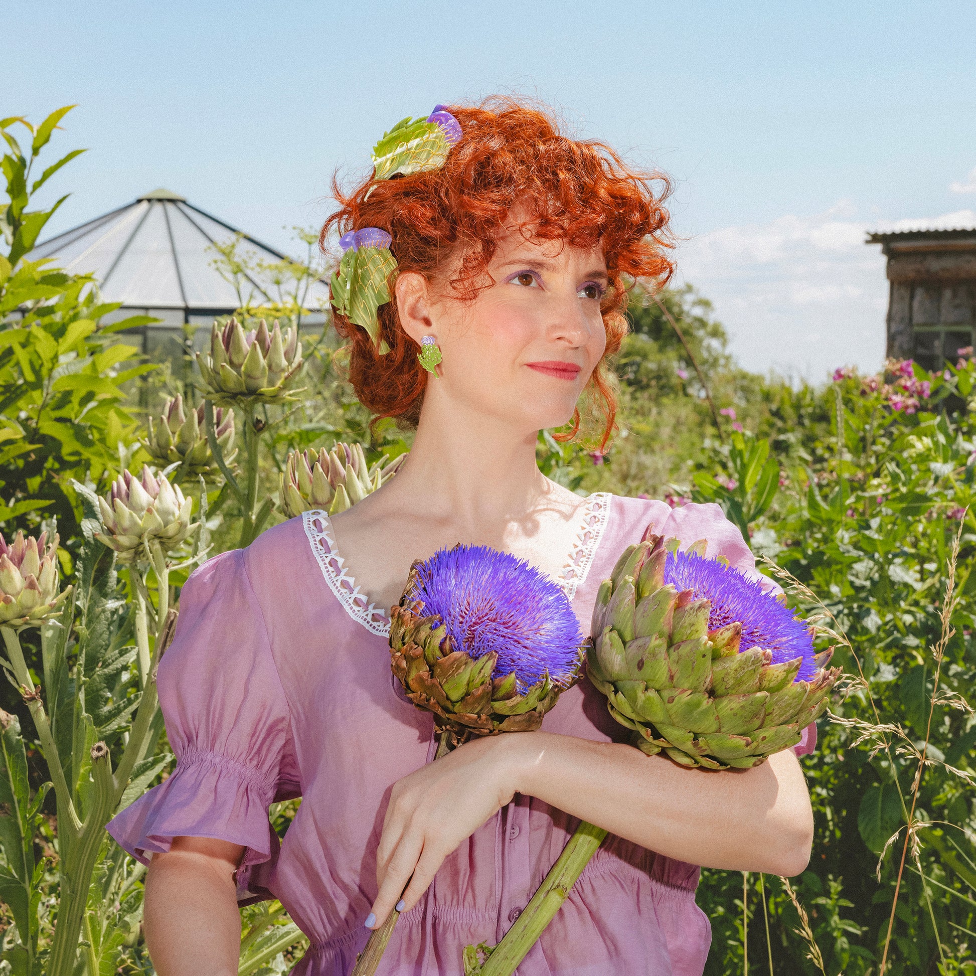 A special tribute to the most beautiful bloom in the vegetable patch: the artichoke flower! We’re enchanted by its cinematic violet hue and sweet, honey-like scent. It was only natural to turn it into a pair of vintage-style earrings, like a precious gem found at a charming flea market.
