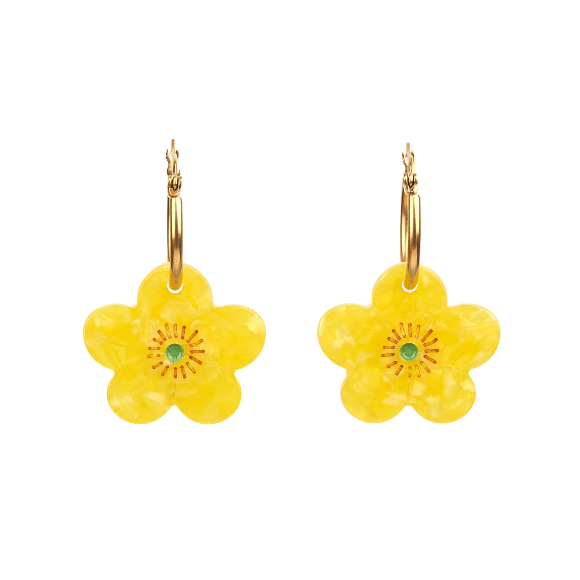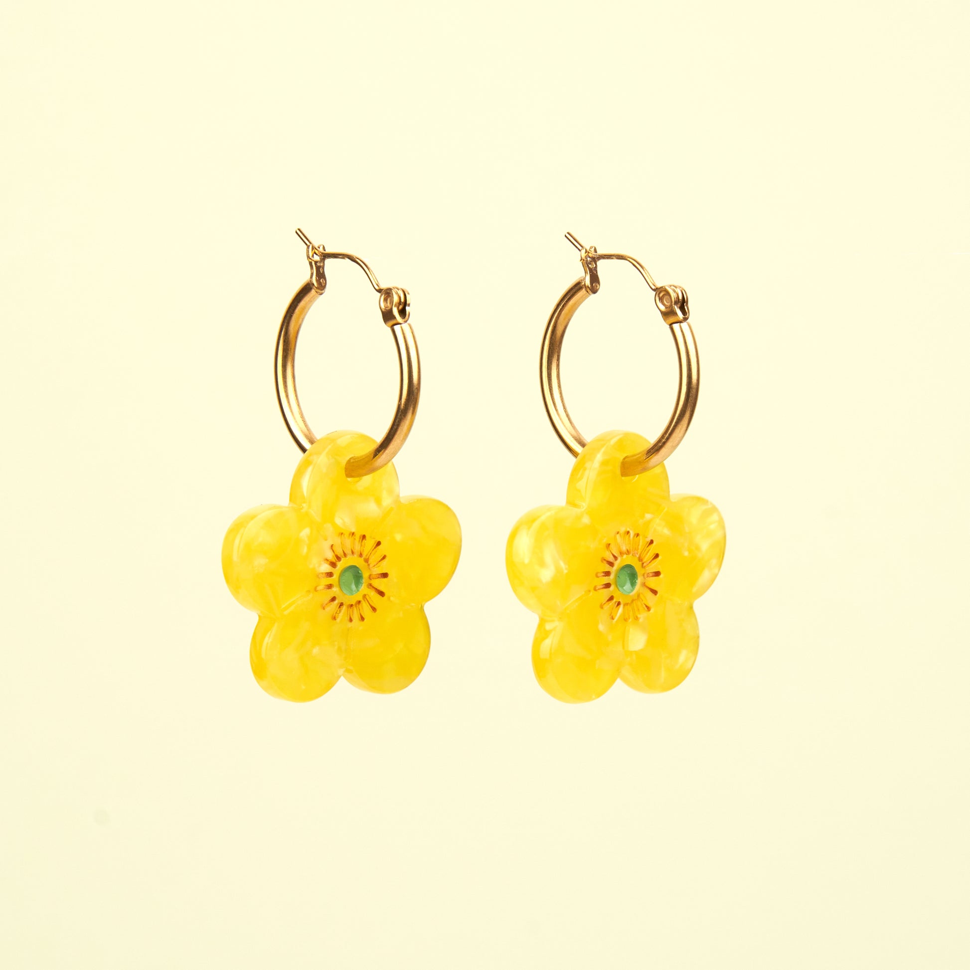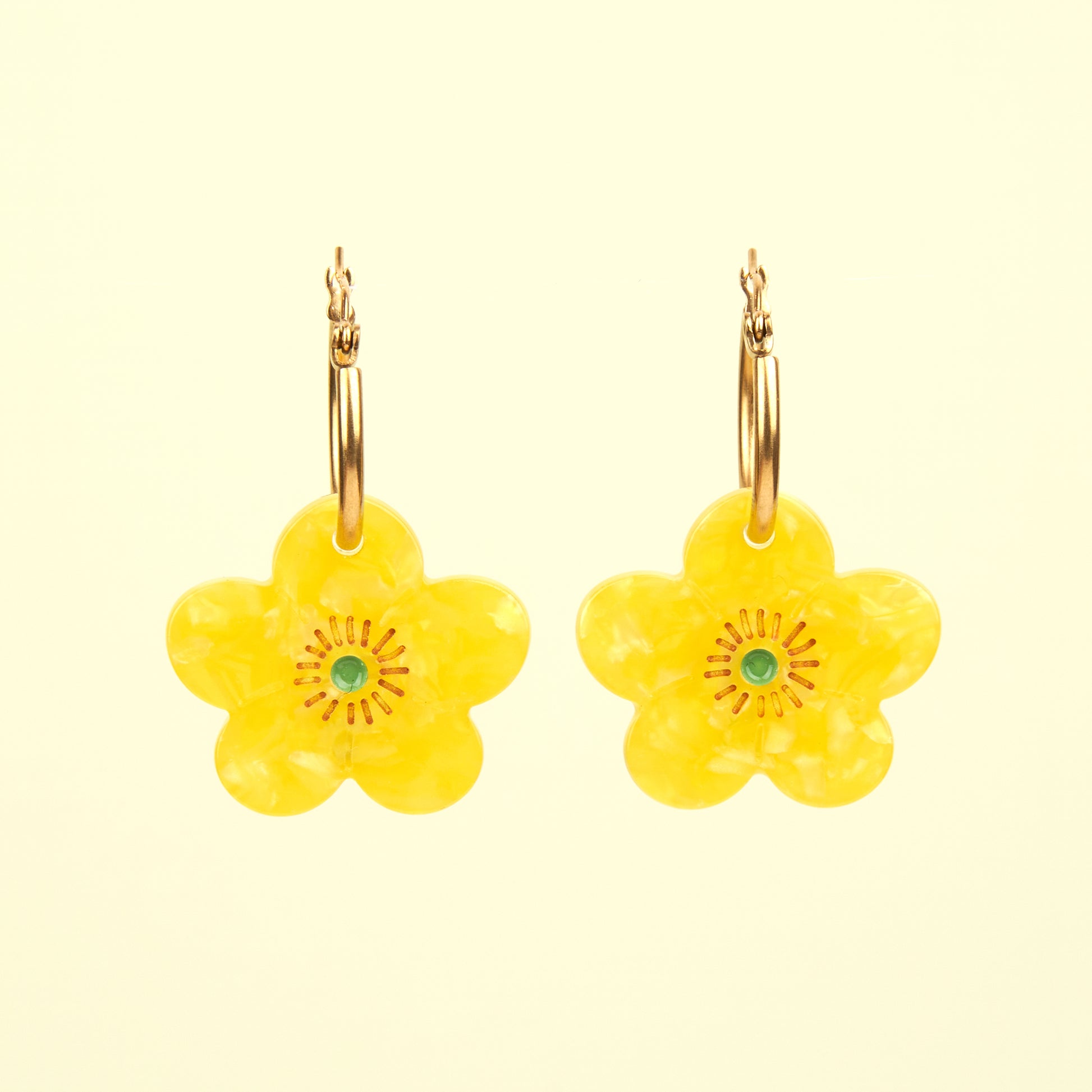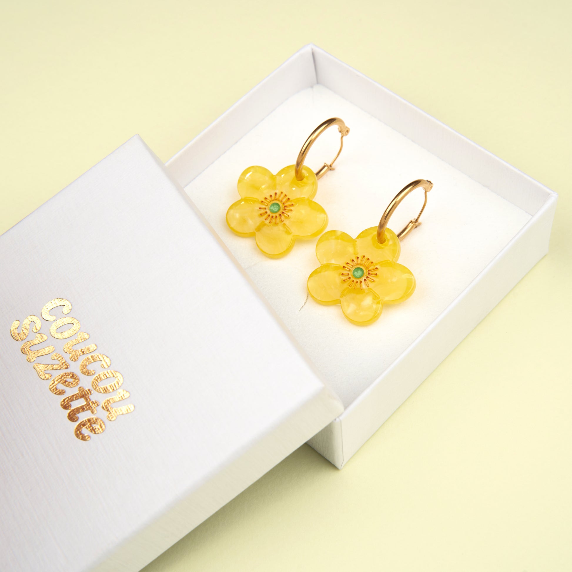 To celebrate the blossom season, we're wearing these pretty flower earrings! Two buttercups looking like little suns hanging from golden hoops, and adding a touch of light to your cute face.
