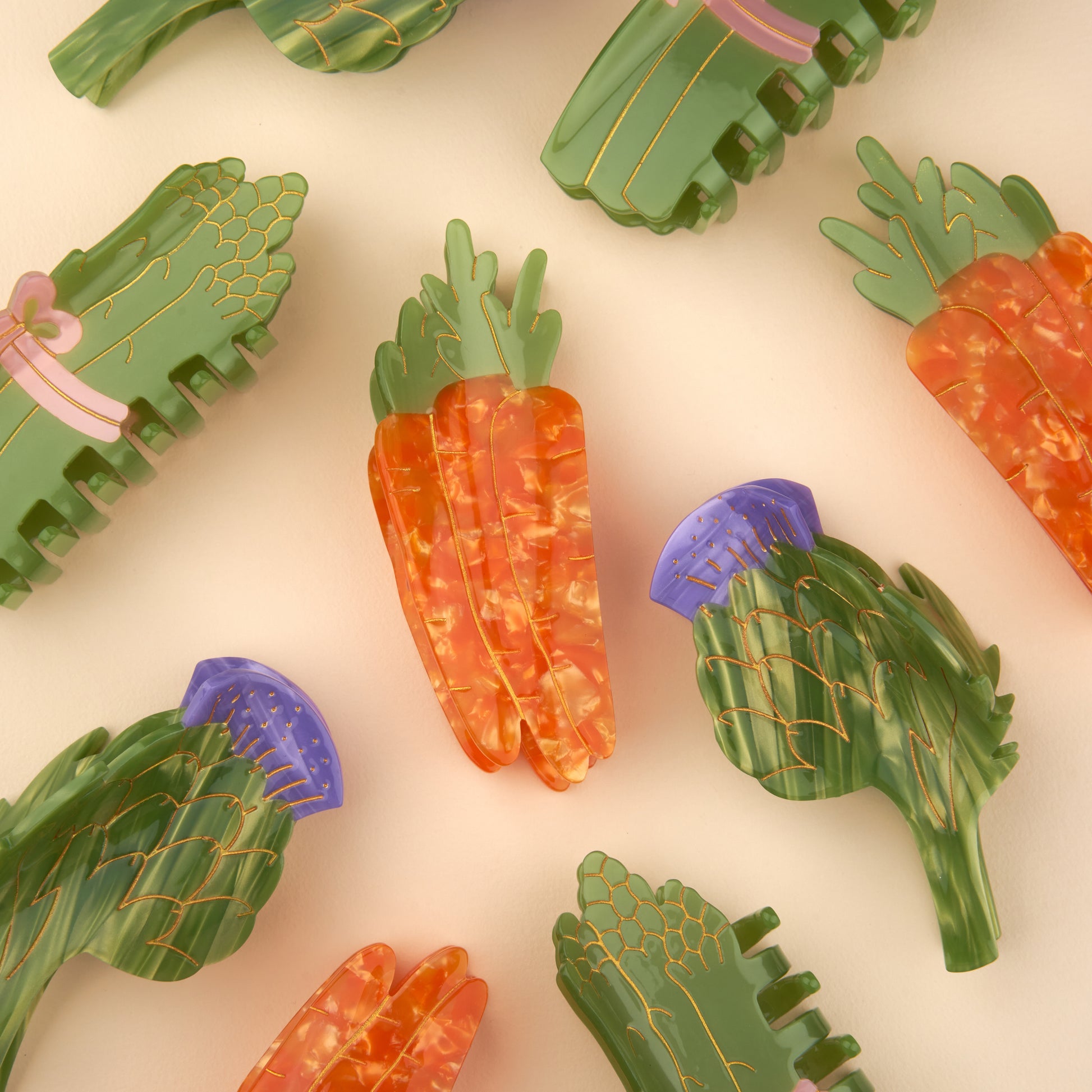 Calling all lovers of crunchy veggies — meet our delightful Carrot hair claw clip! Three neatly bundled carrots, leafy tops blowing in the breeze, ready to tame your messy buns and half-up styles with flair. We’re obsessed with its bold, graphic design and vibrant orange hue that shimmers with every movement. A fun and fresh vegetable hair accessory that adds a juicy pop of color to any hairstyle.