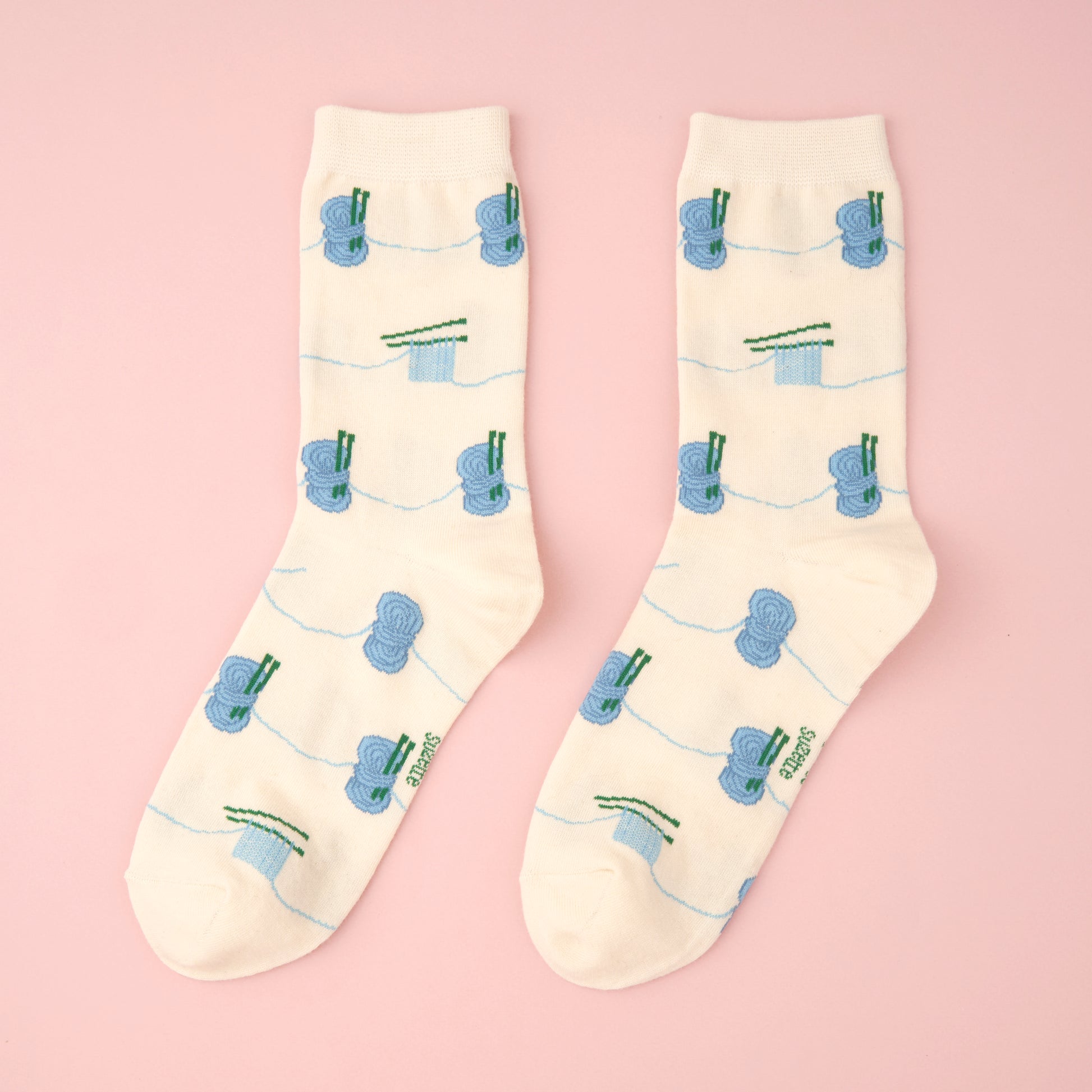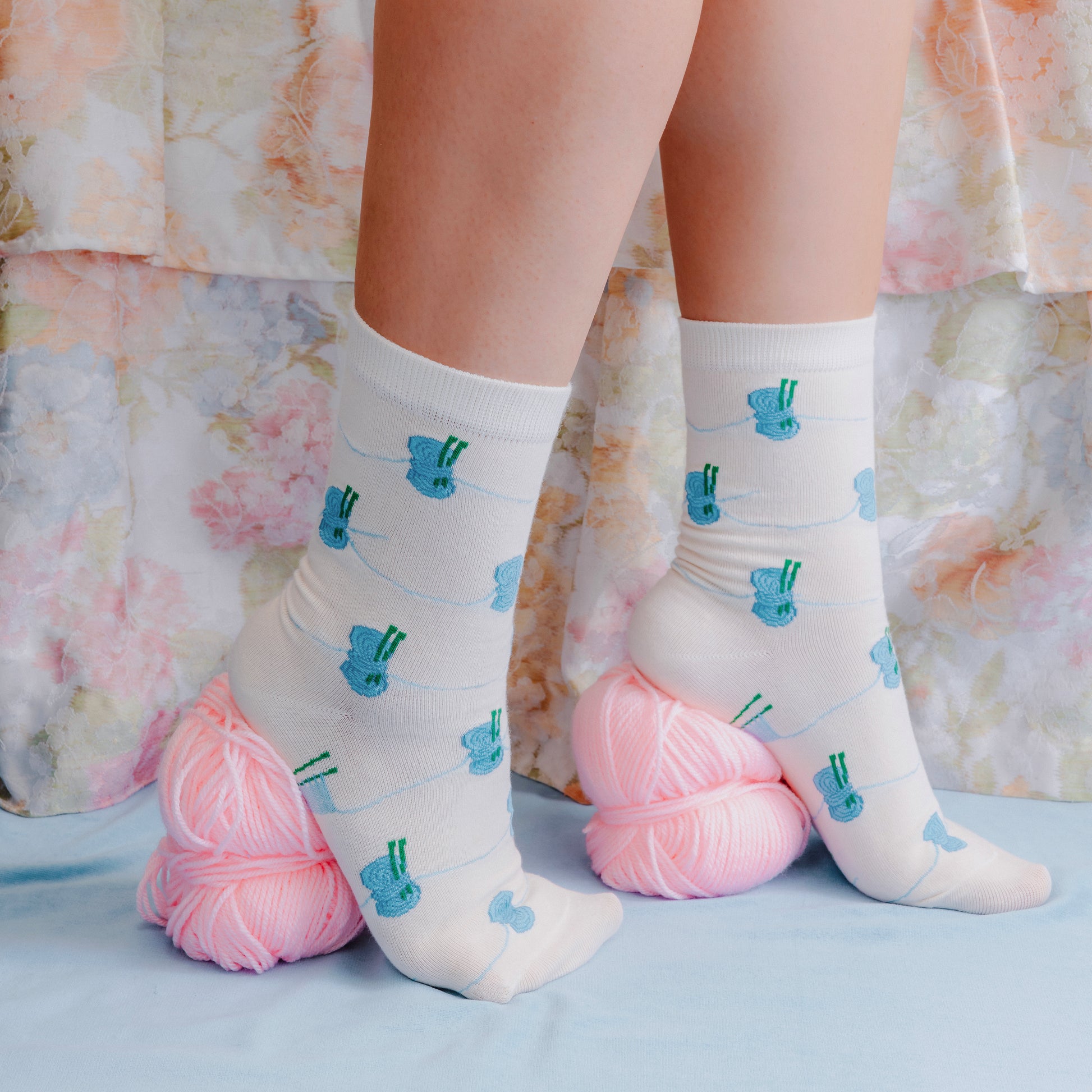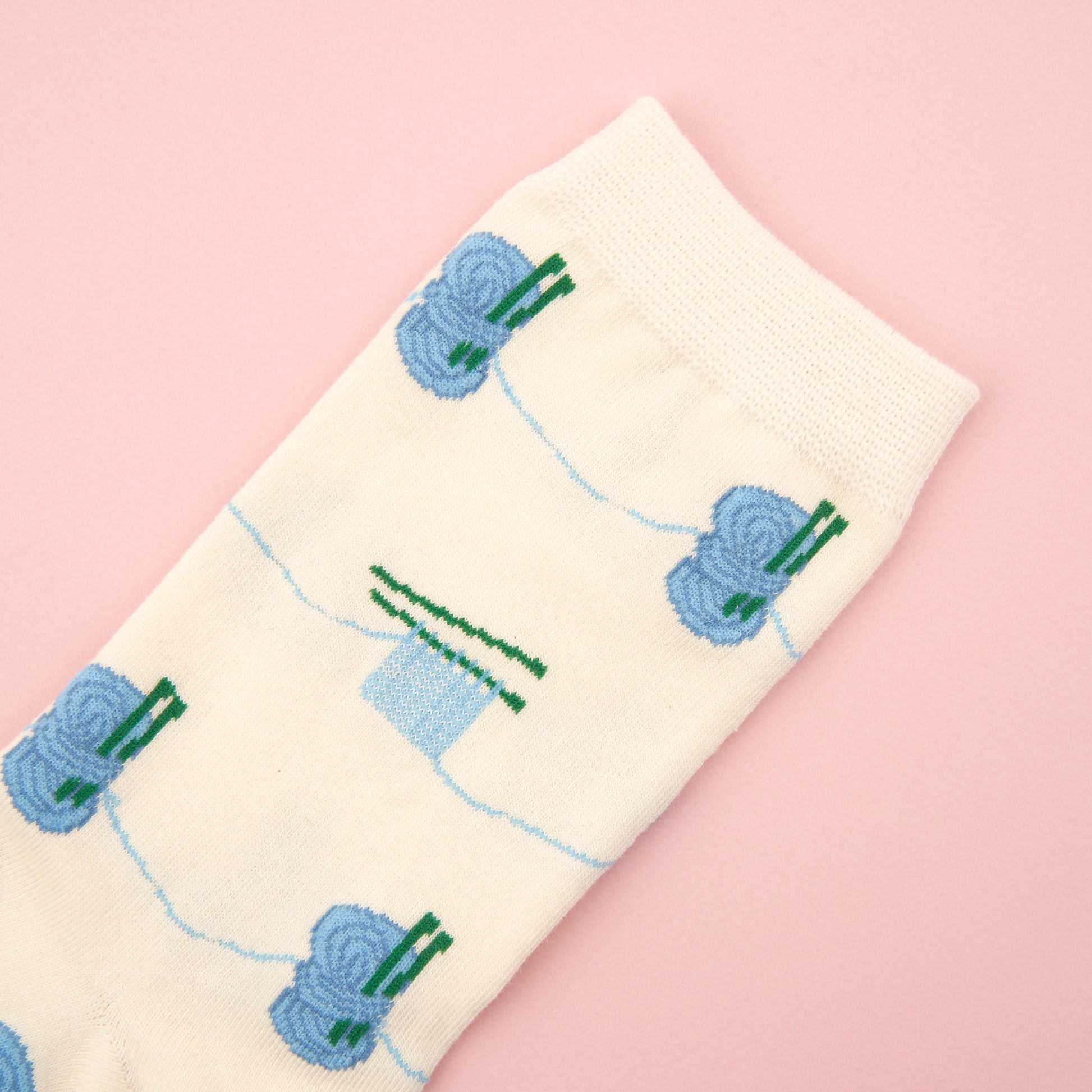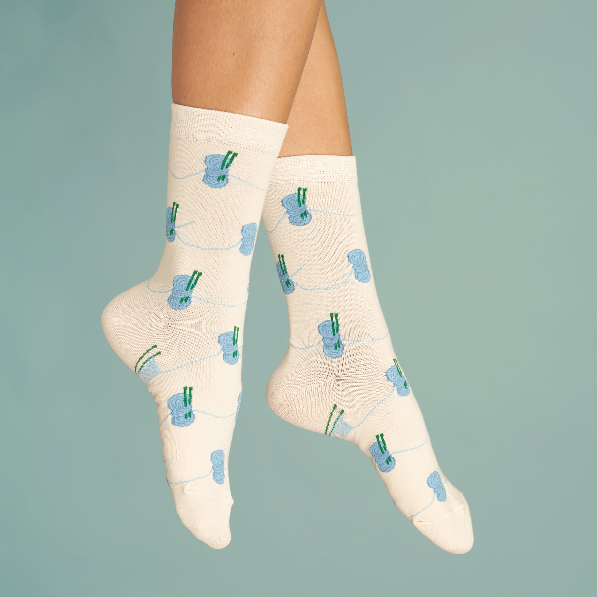 The prize for cosiness goes to this pair of wool ball socks! A series of balls that bring the cutest little knits to life. A beautiful blue and green garland on a cream background that will look great on our feet.