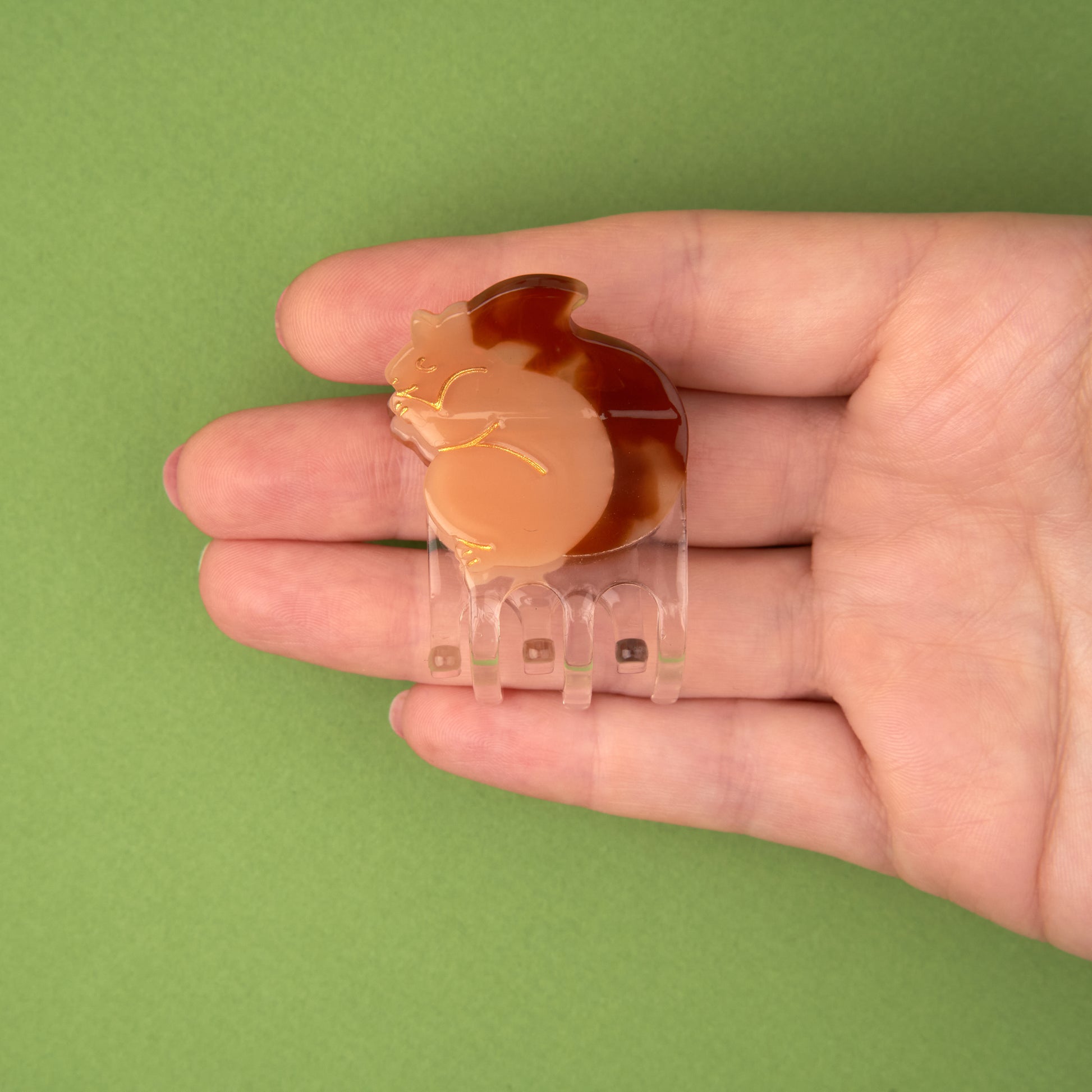 A mini claw clip in the shape of a chubby squirrel taking a nap after collecting nuts all day. We are in love with this cutie and its reddish-brown highlights, who will happily perch in our buns and half-up hairstyles.