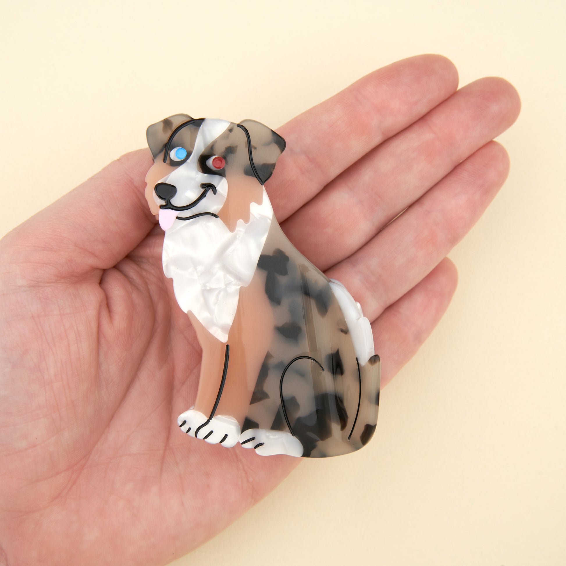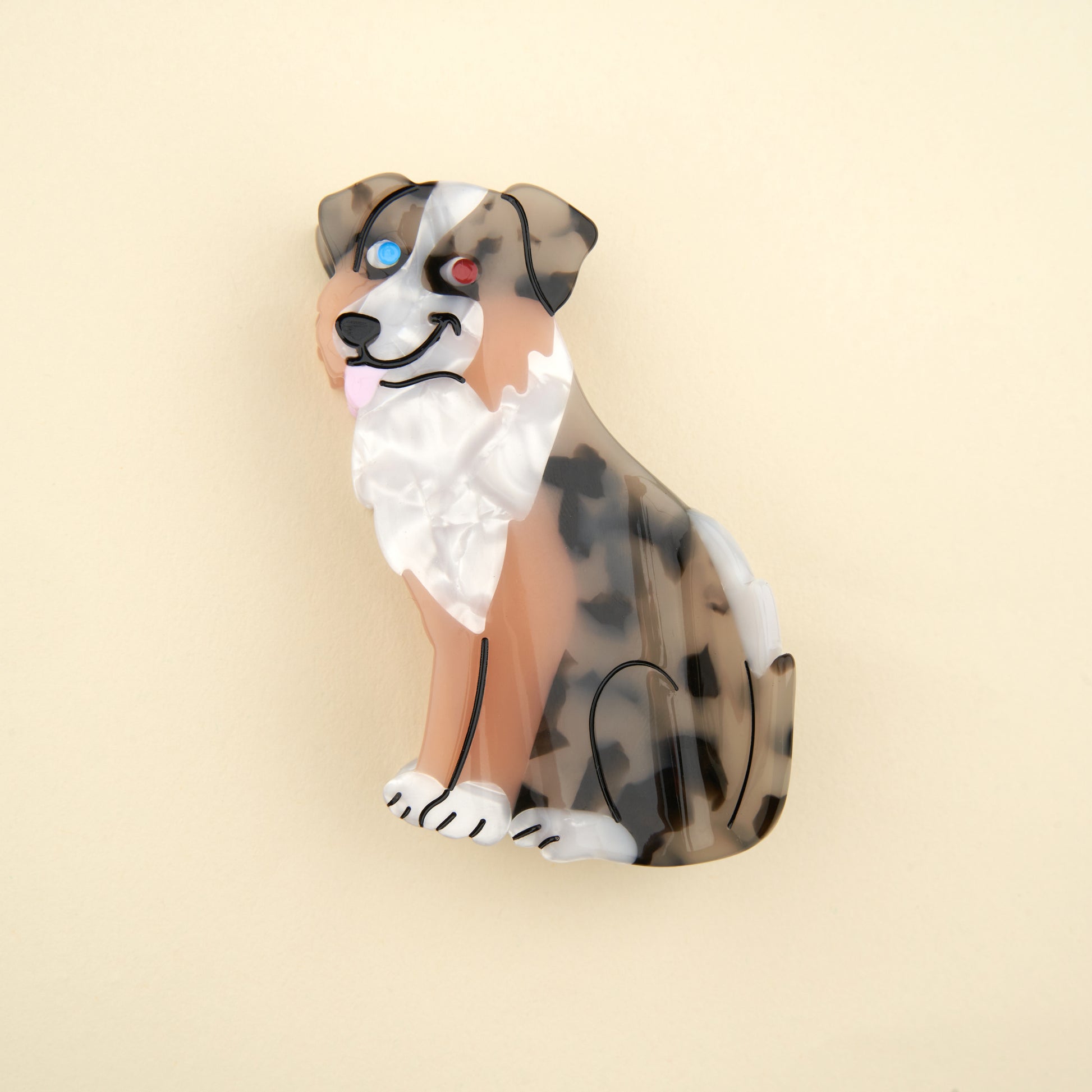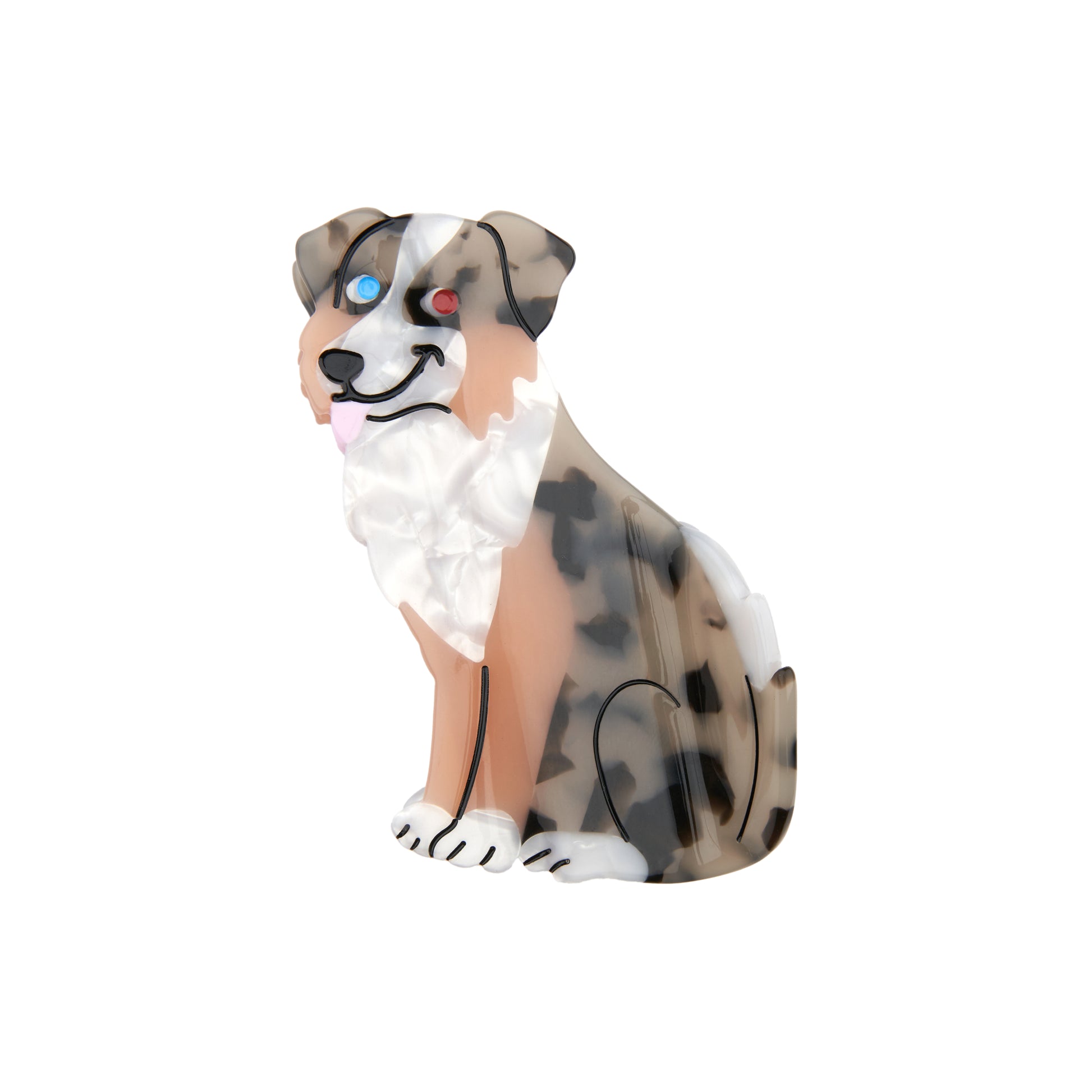 A beautiful acetate hair claw shaped as an Australian Shepherd, known for its nice blue and brown odd-coloured eyes! A majestic dog, very smart and always ready to go to work (unlike us on monday morning…). This dog claw has metal teeth and will guard your hair with discipline!