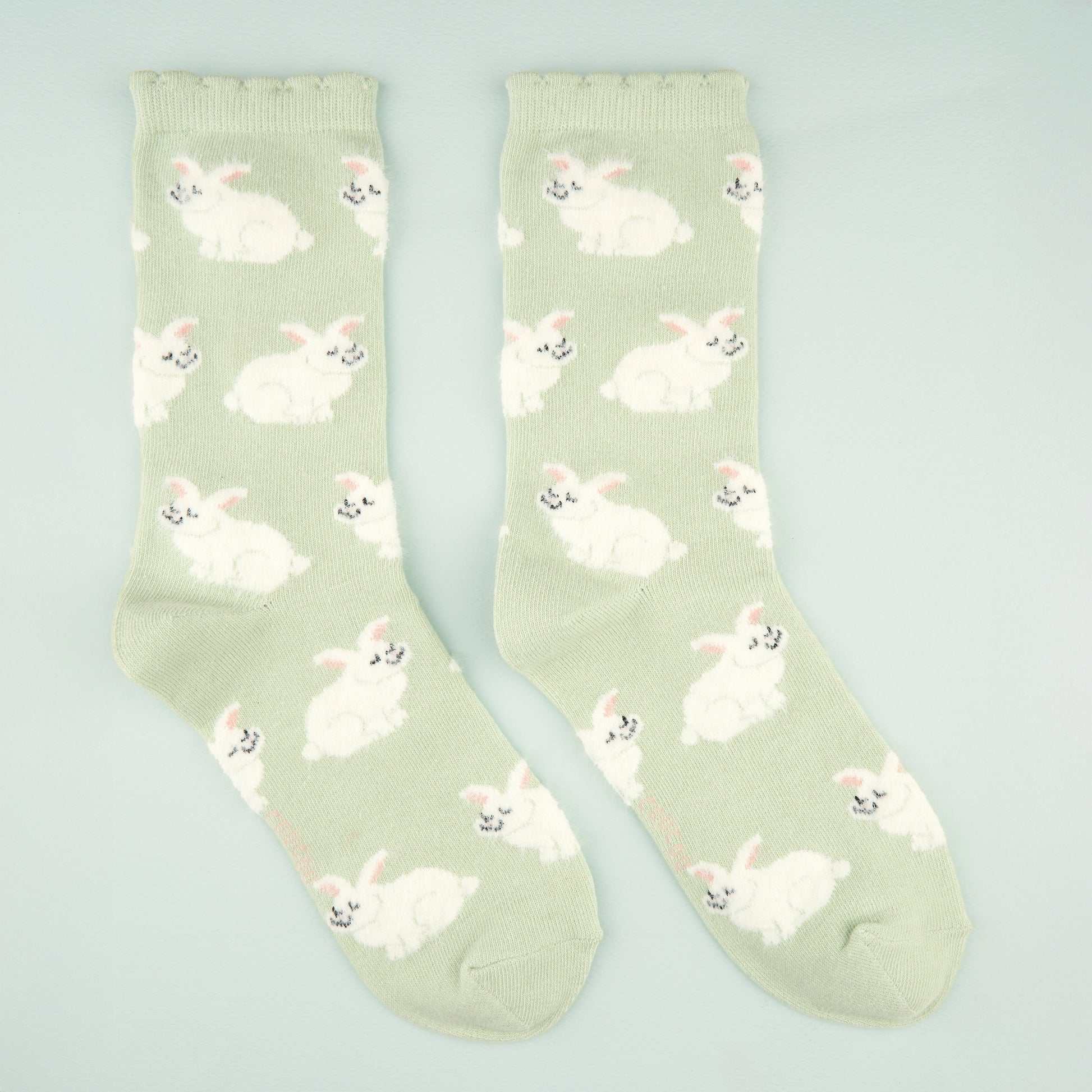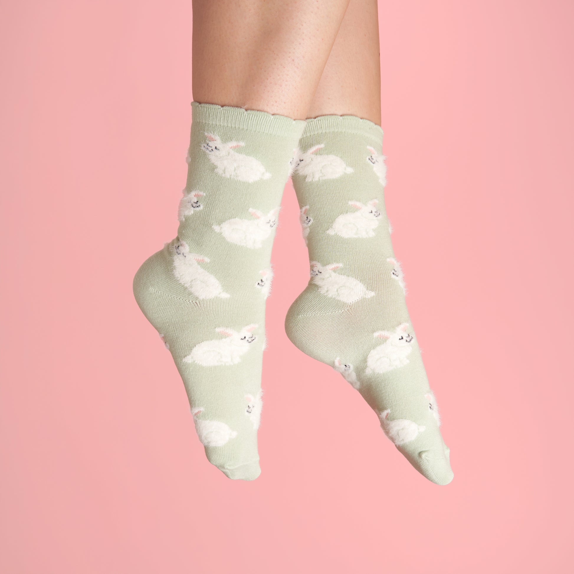 When life feels a little rough, it's time to add soft, fluffy socks to the mix! These original socks feature snow-white bunnies with ultra-realistic fuzzy fur, set against a lovely sage green background. We love the delicate ruffled trim at the ankles—it’s enough to make you want to hop straight into the woods for a little frolic.