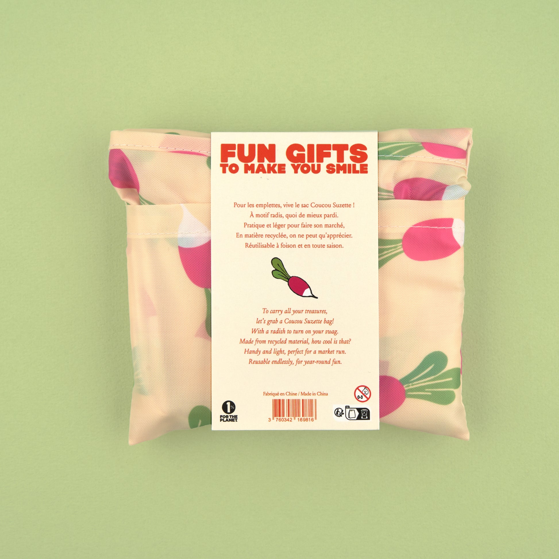 Here’s the little gem that’s about to change your everyday outings: the Coucou Suzette reusable bag! Light as a feather, endlessly reusable, and foldable in a flash, it slips easily into a fanny pack, a purse, or even a jacket pocket, ready to save the day at that crucial moment (“A plastic bag for 20 cents?” – “No thanks!”). We’re obsessed with its super sturdy recycled fabric that carries your weekly groceries like a champ. And of course, it proudly shows off our signature radish print – because being eco-friendly doesn’t mean being boring.