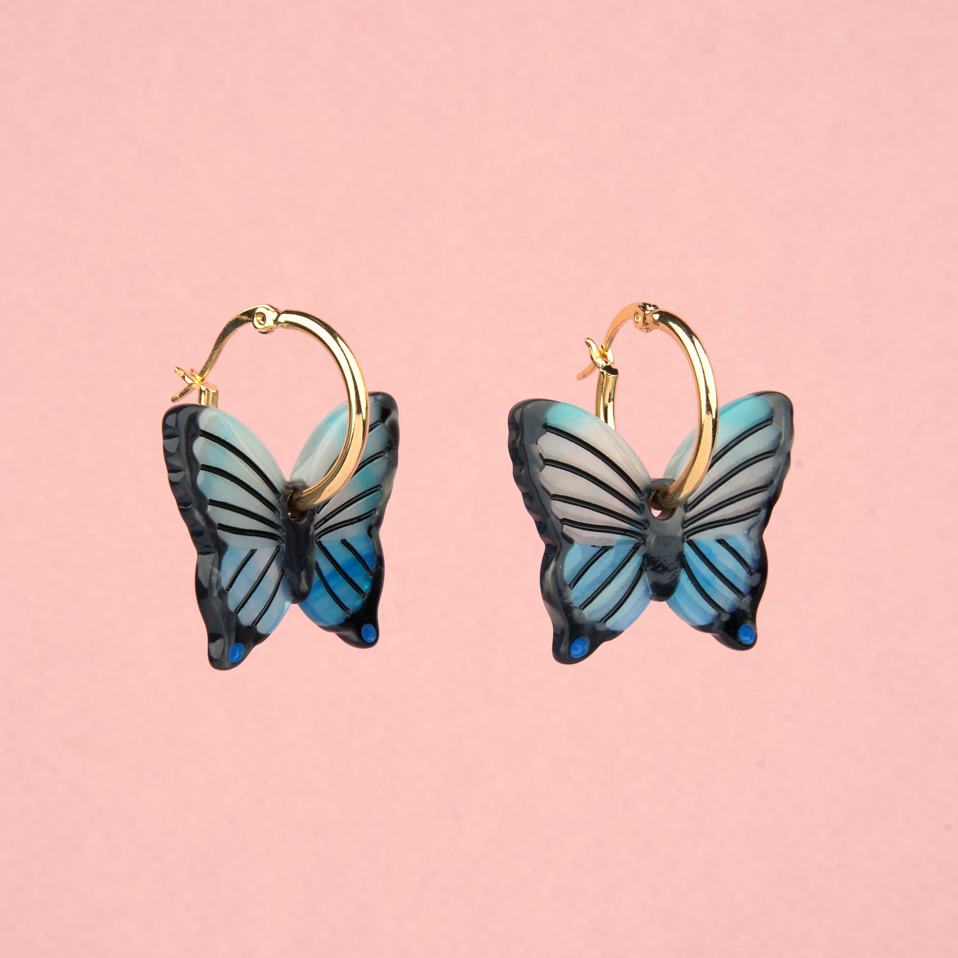 De merveilleux petits papillons bleus qui flottent à nos oreilles, accrochés à de jolis anneaux plaqués or. Ce joli bijou s’accorde parfaitement avec une coiffure haute, pourquoi pas maintenue par une pince assortie ?