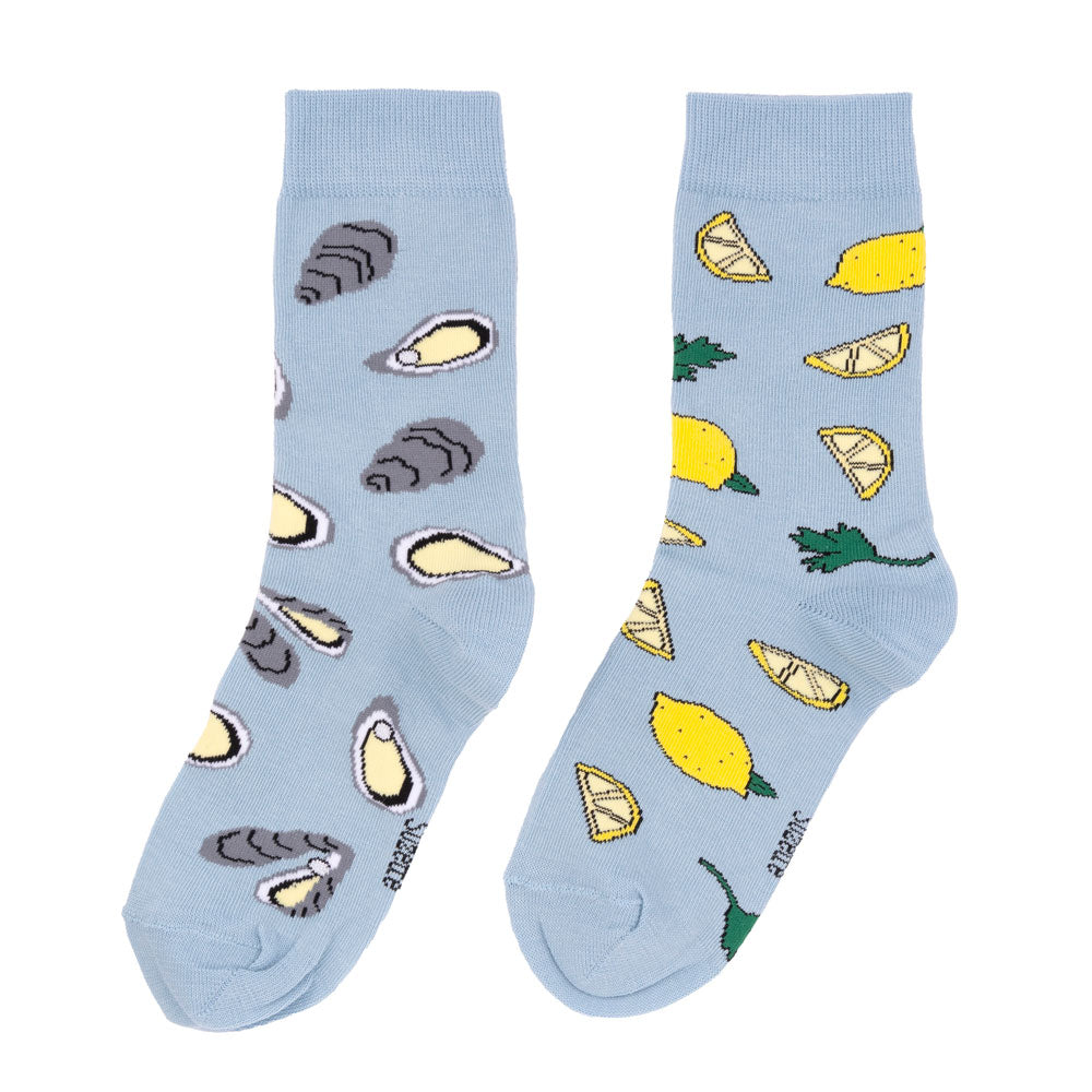 Des chaussettes bleu ciel au motif du repas de fête par excellence : les huîtres !