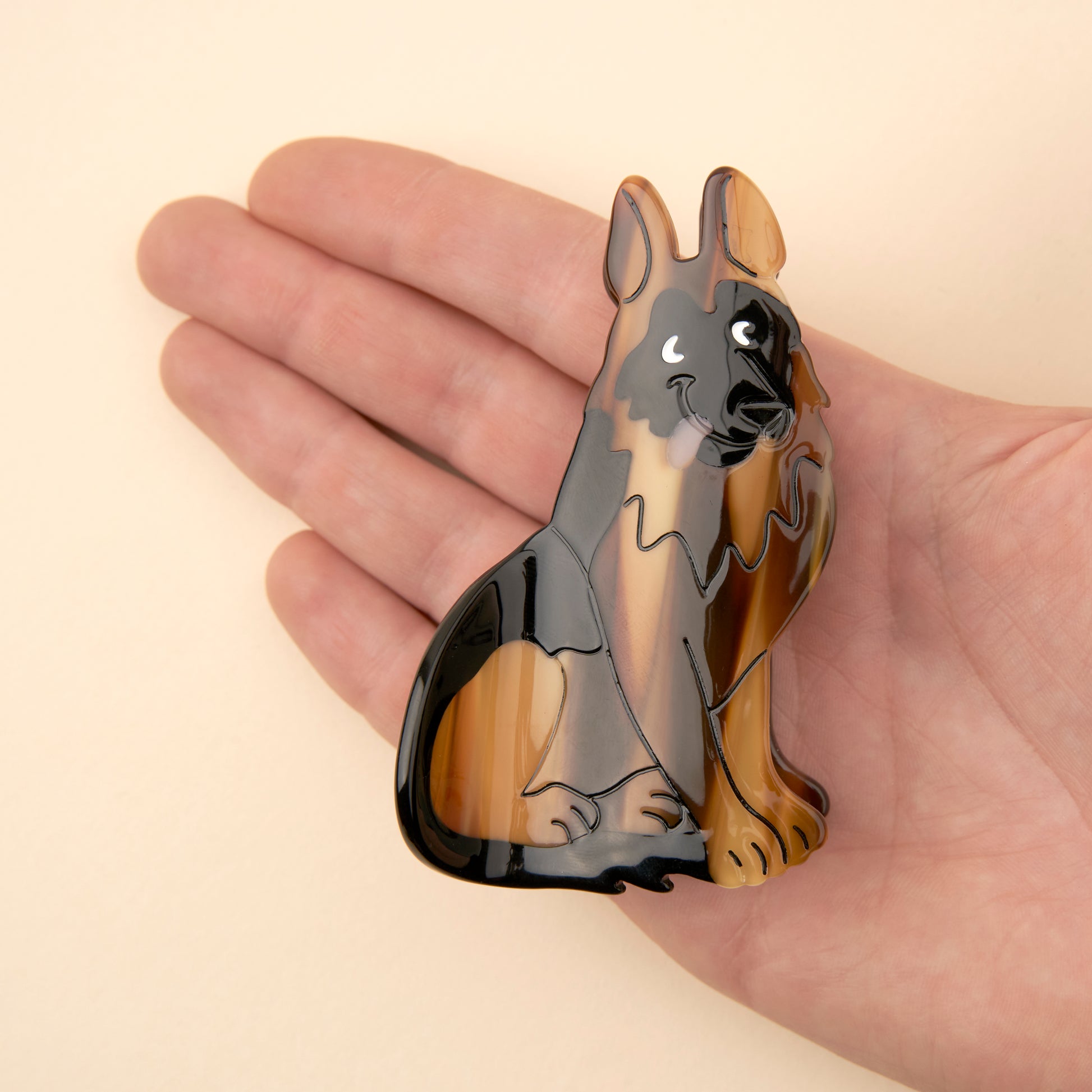 Le Berger Allemand est le chien de garde par excellence, qui considère que c’est lui qui nous balade en crânant du bout de la laisse... Cette jolie pince à cheveux marron aux dents métalliques est l’accessoire idéal pour des coiffures rigolotes en dédicace à notre boule de poils préférée.