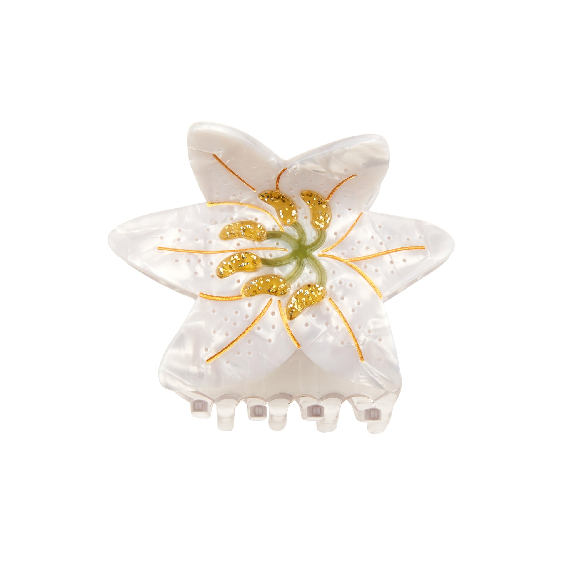 Un magnifique lys blanc en guise de pince à cheveux XL ! On adore cette fleur pleine de symbolique, noble et délicate avec ses jolis pétales nacrés et ses pistils tout en paillettes. Un accessoire pour cheveux particulièrement indiqué pour les épaisses toisons qui sublime toutes les coiffures en un rien de temps !
