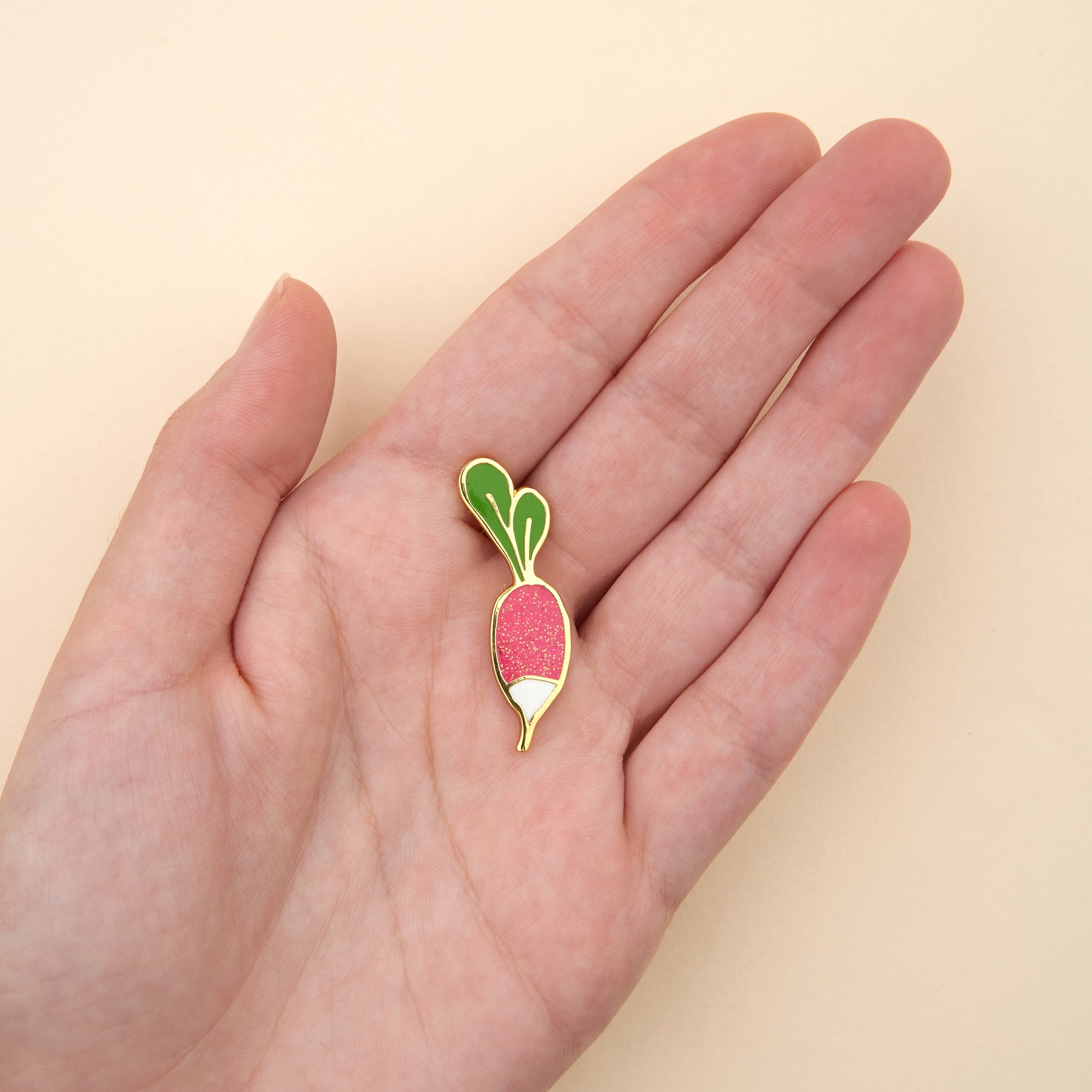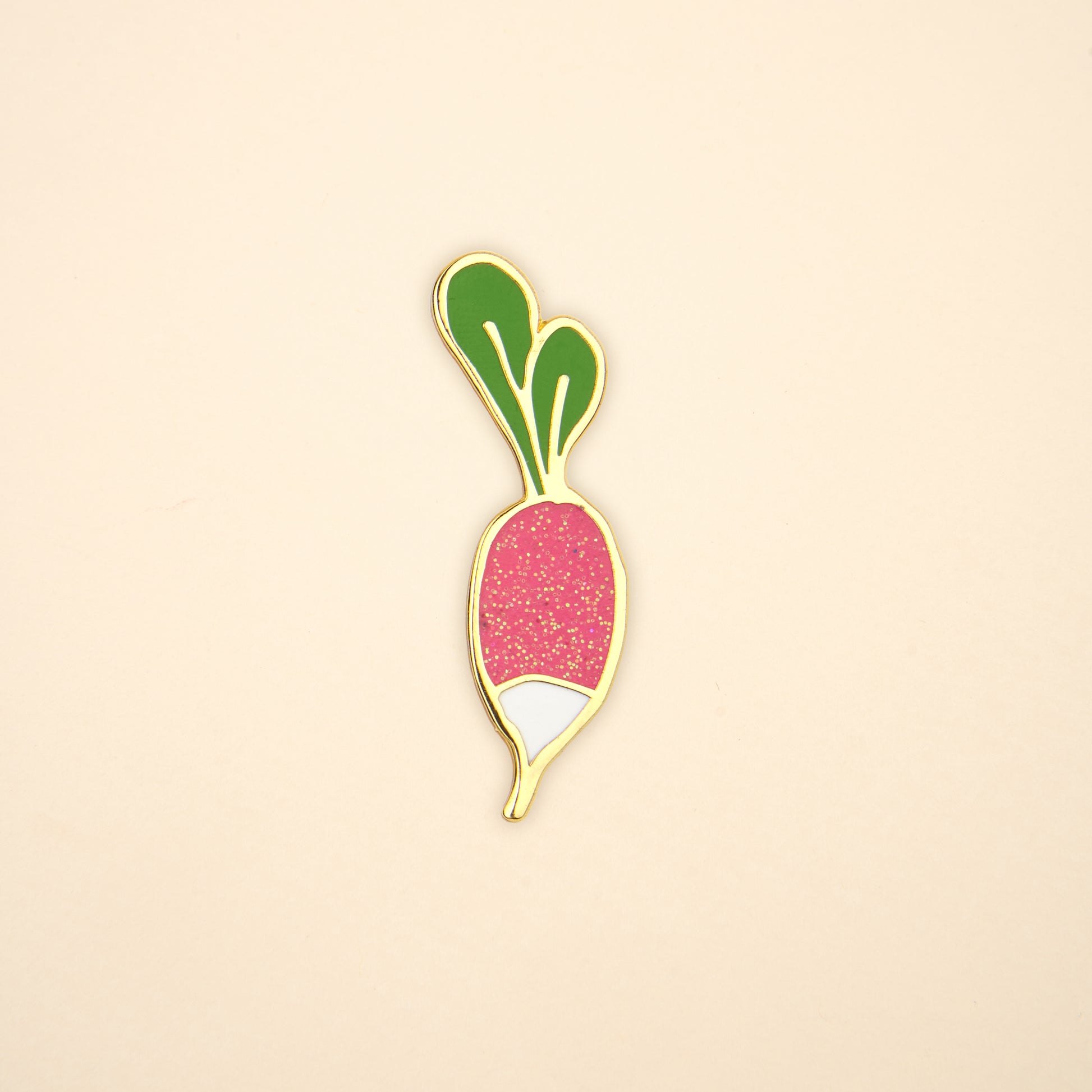 Un mignon petit radis rose pailleté qu’on rêve d’attraper par ses feuilles pour le dévorer ! Un pin’s original pour décorer à merveille vestes en jean et autres cols de chemise. À accompagner de son pote cornichon pour un look à croquer !